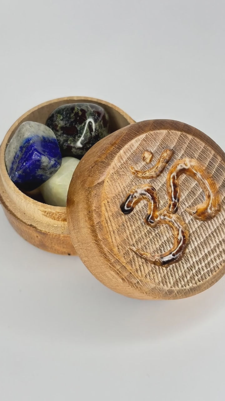 Guarda y protege tus piedras energéticas en esta caja artesanal tallada a mano, decorada con el símbolo OM, un mantra sagrado que simboliza la unidad y la conexión espiritual. Con medidas ideales para altar o uso personal, esta caja de madera ofrece un acabado único que potencia la energía de las tres piedras incluidas: protección para mantener la energía limpia, amor para fortalecer vínculos y fortuna para atraer prosperidad. Un cofre diseñado para acompañar tu